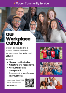 We believe that a diverse and inclusive workplace culture contributes to all staff feeling valued and safe. We are committed to WCS’s purpose and are adaptive and responsive to the needs of our community and colleagues. This commitment to a positive culture will help our service users receive, safe and high quality services.