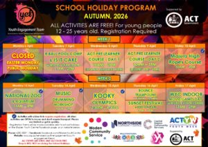YET runs a holiday program for young people each school holiday period. Spaces are limited so get in quickly by downloading and completing the School Holiday Program (SHP) Application Form and returning it to yet@wcs.org.au